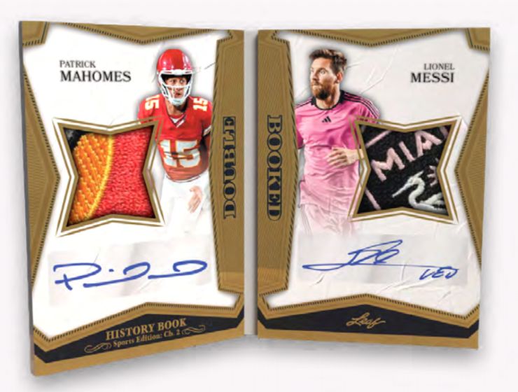 In each 10-box case, collectors should expect to find 5-6 multi-signed booklets, and a combined three total signatures from the following players: Aaron Judge, Patrick Mahomes, Bobby Witt Jr., Charles Barkley, Giannis Antetokounmpo, Conor McGregor, Lionel Messi, Peyton Manning, Stephen Curry, Paul Skenes, Nolan Ryan, Bo Jackson, Larry Bird, Floyd Mayweather Jr., Bob Cousy, and Barry Sanders.
